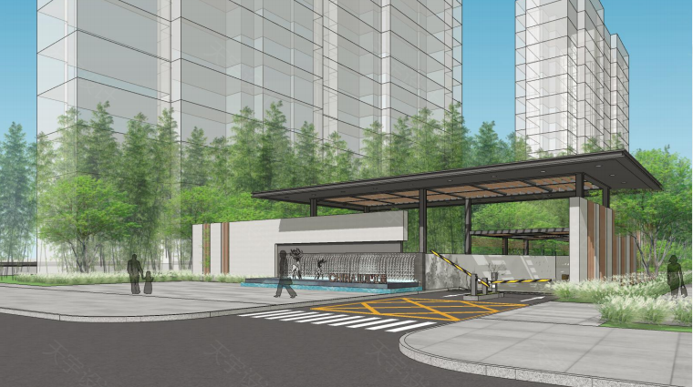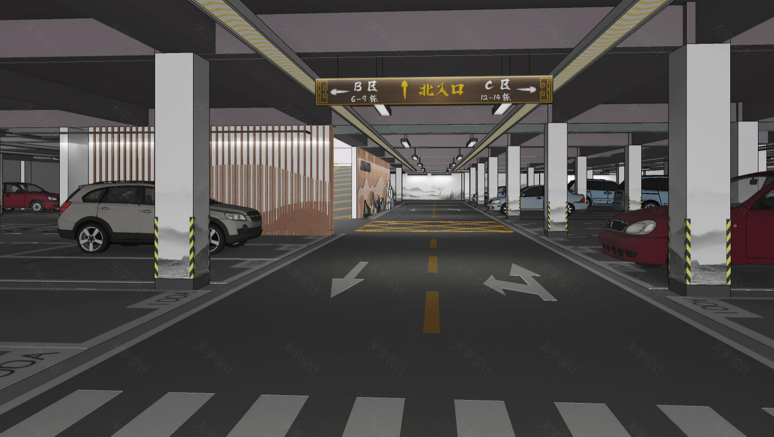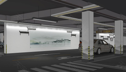 以造型簡潔的門式作為坡道的入口空間。中式園林片墻的運用,空間隔而不斷,使車庫內部空間與外部的景觀界面和諧銜接起來。小范圍的水景為入口處增添了一些生動的靈韻,增加了入口的儀式性。坡道下地庫處與室外銜接,采用木格柵和云片石裝飾,再一次突出主題。地下室周圍外墻則設計為水墨山水畫涂料噴繪,體現整個方案的意境。