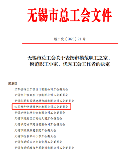 近日,無錫市總工會(huì)下發(fā)《關(guān)于表揚(yáng)市模范職工之家、模范職工小家、優(yōu)秀工會(huì)工作者的決定》,表揚(yáng)100個(gè)集體為“無錫市模范職工之家”,江蘇天宇設(shè)計(jì)研究院有限公司工會(huì)委員會(huì)榮獲“無錫市模范職工之家”稱號(hào)。在揚(yáng)名街道總工會(huì)的支持和指導(dǎo)下,我院工會(huì)持續(xù)發(fā)揮維護(hù)職工合法權(quán)益的基本職能和“橋梁紐帶”作用,深入開展“職工之家”建設(shè)工作,充分調(diào)動(dòng)員工的凝聚力和向心力。