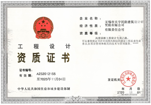 近日,無錫市天宇民防建筑設(shè)計研究院有限公司順利獲得江蘇省住房與城鄉(xiāng)建設(shè)廳頒發(fā)的風(fēng)景園林工程設(shè)計專項乙級資質(zhì)證書,為今后我院開辟新領(lǐng)域、培育新經(jīng)濟(jì)增長點提供了良好的資質(zhì)保障。