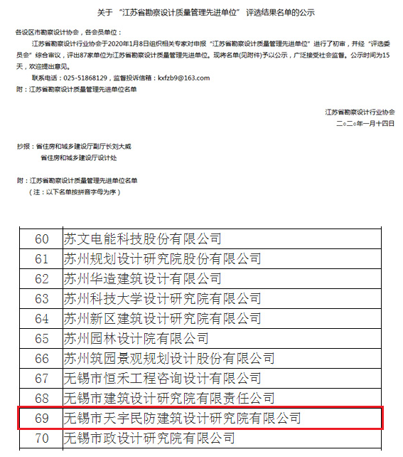 近日,江蘇省勘察設(shè)計(jì)行業(yè)協(xié)會(huì)公布“江蘇省勘察設(shè)計(jì)質(zhì)量管理先進(jìn)單位”評(píng)選結(jié)果名單,無(wú)錫市天宇民防建筑設(shè)計(jì)研究院有限公司榜上有名。